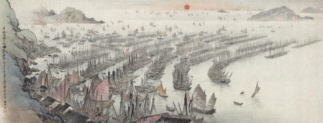 这次展出的笔墨,在任何时代的一批作品中,都表现出应野平在老一辈画家中的以身作则,以国画的方式为时代留下永恒的印记。其中创作于 1960 2008年的《千帆迎晓日》特别壮观,让观众颇为兴奋。看见一大批船帆队向前航行,海天相连,初升的红日光芒四射。应野平的儿子应黎生告诉记者,这是父亲在舟山群岛来来去去画了很多素描后创作的。“五六十年代是我父亲创作的全盛时期。那时候他精力充沛,一有时间就到全国各地写生,每次都画很多素描。"应野平的女儿应该真的补充道:"当时去舟山写生的画家中,有很多都晕船晕倒了,偏偏我父亲精力充沛。看见海面上有那么多船,气势磅礴,他便特别激动,一刻不停地画画。"
