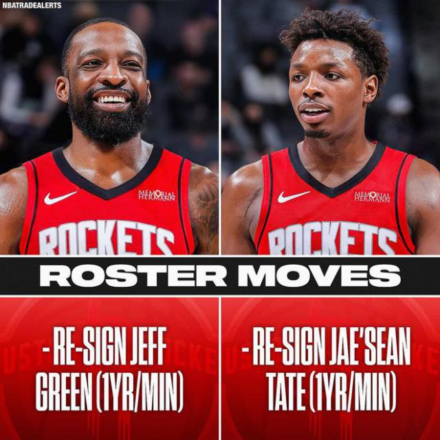 现在,火箭还有一份全中产合同,并签下了泰特、杰夫和杰夫。 · 在格林和霍勒迪之后,火箭仍然有薪水和球员名额,可以继续签下球员。此前有报道称,火箭将裁掉他们的第三中锋乔克。 · 兰代尔。另外两名双向合同球员大卫 · 罗迪和恩法利 · 同时,丹特也将与火箭签订双向合同,因此现在火箭的阵容相当整齐。