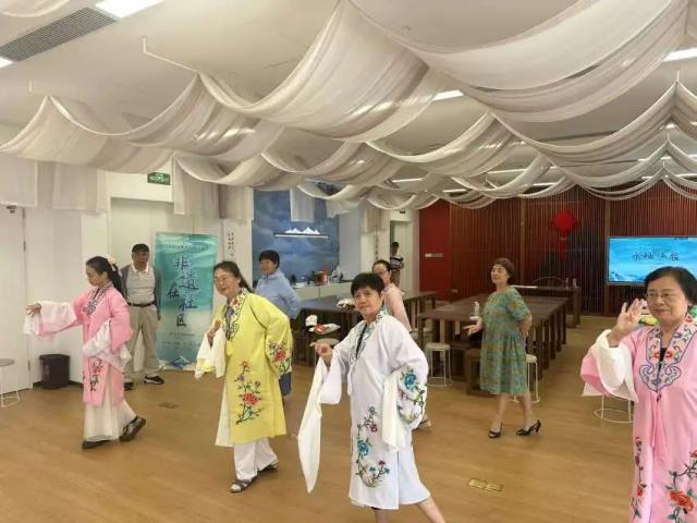 在社区文化活动中心大师工作室,二级演员和专业淮剧演员亲自指导,给参与者带来身临其境的非遗水袖技艺感受。在名师的示范和动手教学下,参与者通过唱歌、训练、身体训练等多种方式感受传统戏曲的当代生命力。