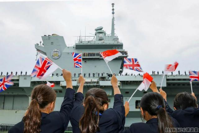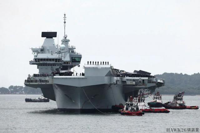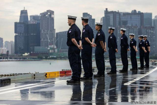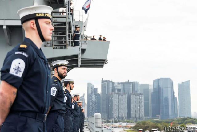 这次停靠恰逢英国新加坡建交。 60 周年纪念日,当“威尔士亲王”号航母驶入新加坡时,水兵们在飞行甲板上排队。“威尔士亲王”号航母这次到达新加坡是为了执行一项持续八个月的高桅杆行动。(Operation Highmast)“任务,航母打击组将通过地中海和中东前往西太平洋沿岸地区,经过十几个中国,并与英国的盟友和合作伙伴进行一系列联合演习。