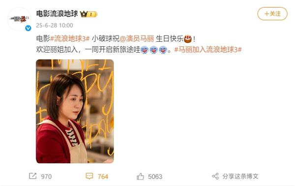 快科技 6 月 28 电影《流浪地球》 今日发文祝演员马丽生日快乐,并正式宣布其加盟影片。