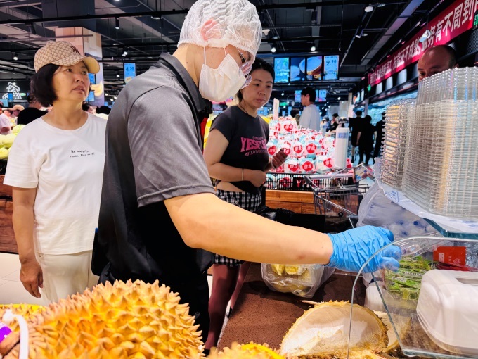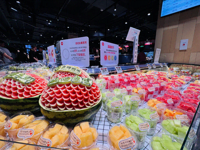 泰国金枕榴莲在水果区占据C位,集荔技、山竹等时令爆款于一体,同时推出了榨果汁、鲜切水果和标有最佳食用顺序的切割拼盘。