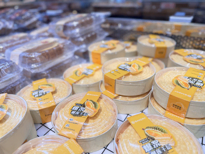 烘焙区不仅有手指提拉米苏、爆浆马斯卡彭等爆款蛋糕;新产品“丰收的喜悦”欧式包装,嵌入南瓜、紫薯、红薯、栗子等多种果蔬;“核桃满满”欧式包装,核桃满满,营养健康;主要产品“榴莲千层”精选马来西亚成熟猫山王榴莲,果实含量超过40%,柔软、厚实、醇厚、顺滑,三层厚铺带来完美的爆浆口感。令人敬佩的是,全线烘焙产品禁用脱氢乙酸钠、代可可脂等添加剂,坚持健康品质。