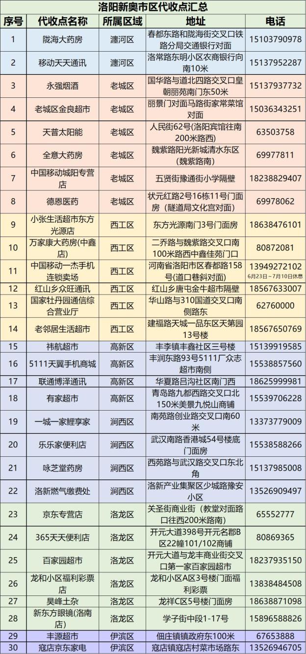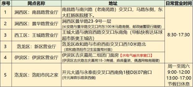 卡表客户可以到洛阳市其他营业厅和代收网点支付费用,具体地址和信息如下: