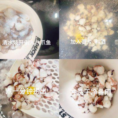 4、锅内清水煮沸,倒入切好的八爪鱼,加入姜片米酒大火煮一分钟,捞出八爪鱼清理干净备用。