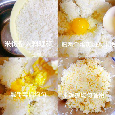 3、首先将蒸好的米饭倒入料理碗中,将两个鸡蛋的蛋黄放入米饭碗中,戴上手套充分搅拌均匀,米黄呈金黄色备用。