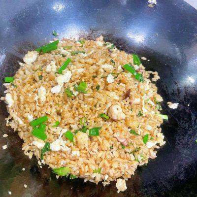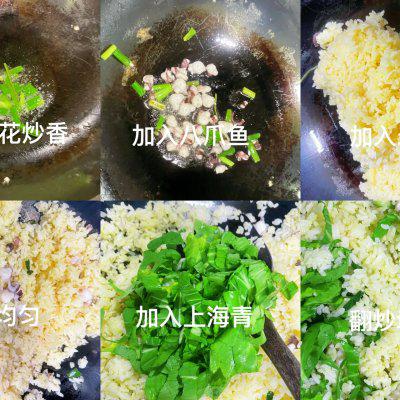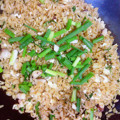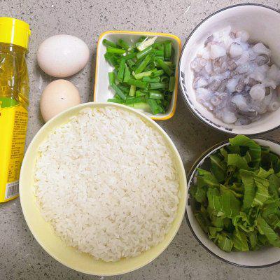 7、锅内油热后加入葱花炒出香味,加入处理好的八爪鱼炒匀,加入米饭,将米饭炒松后加入上海青炒匀称。