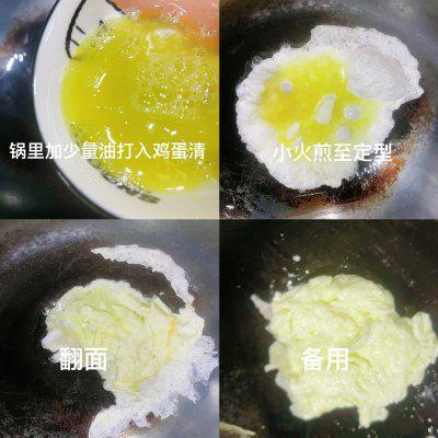 5、将适当的油倒入锅中,打入蛋清,用小火,两年煎熟倒出备用。