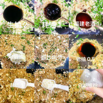 8、此时使用小火,加入生抽。 2 勺 . 耗油 1 勺子,福建老酒 1 勺子,炒匀后,加入炒好的蛋清,炒匀,加入半勺酱油上色,盐 1 勺,鸡精 1 勺子,少量白胡椒粉炒匀。