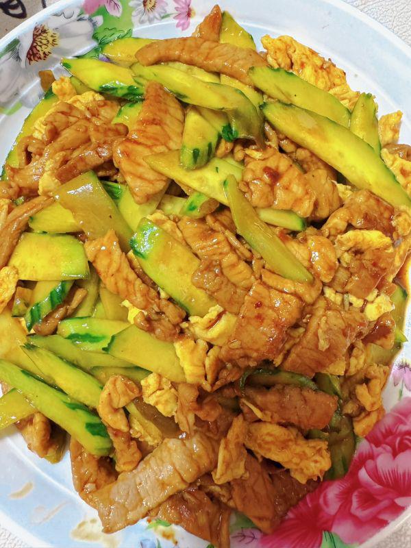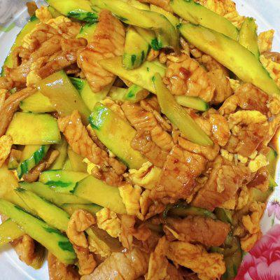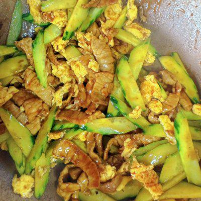 2、将黄瓜炒熟,加入酱油、胡椒、盐、鸡蛋炒匀即可;