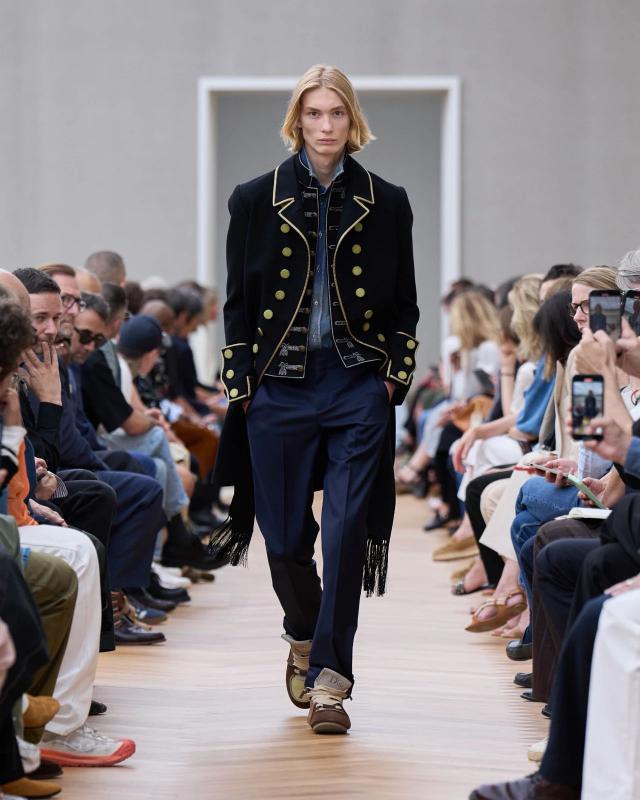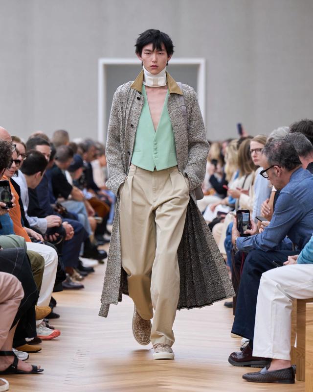 Jonathan Anderson 资深粉丝一眼就会认出他在造型搭配上的“小心思”,比如带袜子的渔民凉鞋。简单的爱尔兰多尼戈尔粗花呢(来自设计总监的故乡)和军团领带的使用,让正装的设计语言焕发出新的活力。