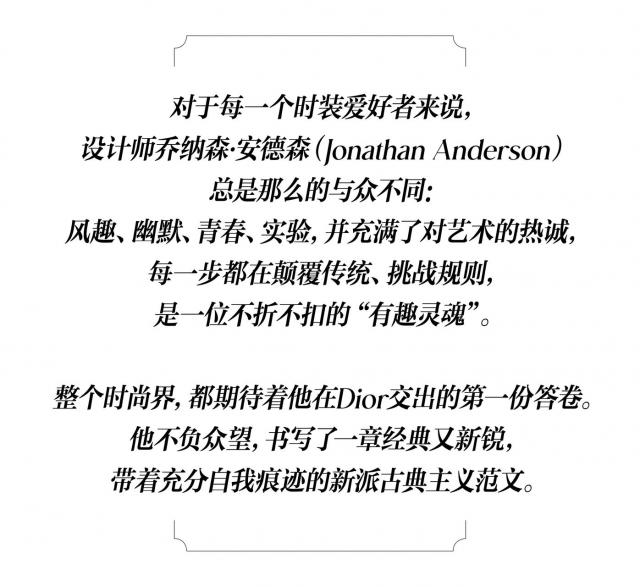 "对于我来说,这是一个解读品牌的过程,我们希望最终能够找到答案," Jonathan Anderson 在一次采访中,“当你进入像迪奥这样著名的品牌时,你不能害怕过去。人们希望一个有历史的品牌展示历史,但他们也希望它能被重新解读。你需要深入研究,吸收它,然后重构它。”