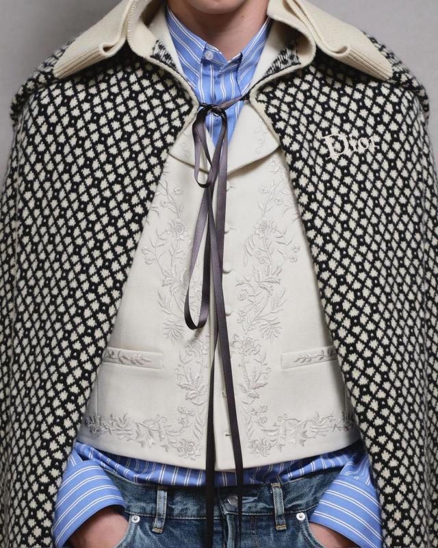 将历史服饰词汇以细腻的手法融入到现代男装的轮廓中,就像一个精彩的历史回顾:从“迪奥套装”(Bar Jacket)"、18-19世纪的燕尾服男士马甲。