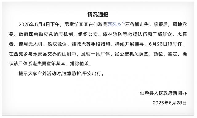 6 月 28 福建省仙游县人民政府新闻办公室日晚发布情况报告:2025 年 5 月 4 一天下午,男孩邹某某在仙游县西苑乡石谷解走失。接到报告后,当地党委、政府启动应急响应机制,组织公安、森林消防等救援队伍、干部群众、志愿者,继续通过无人机、热成像仪、搜救犬等方式进行搜索。6 月 26 日 18 时许,在西苑乡与永泰县交界处的深涧中,发现了一具尸体。经公安机关调查、调查、鉴定,确认该尸体系走失男童邹某某,排除谋杀。
