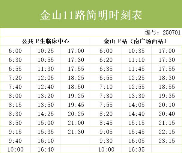 为响应金山铁路运行图优化升级,加强公交铁路连通效率,提高市民通勤出门的便利性和及时性,金山公交将从7月1日(周二)开始优化调整部分公交线路运行时间,同时增加末班车出发时间。具体安排如下: