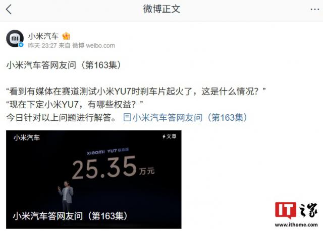 IT 世家 6 月 29 日消息,小米汽车昨晚发布回答网友提问(第一 163 集),针对有媒体在跑道上检测小米。 YU7 刹车片着火,YU7 对未来交付时间是否有可能提前,智能调光天慕的耗电量如何等问题进行预测。
