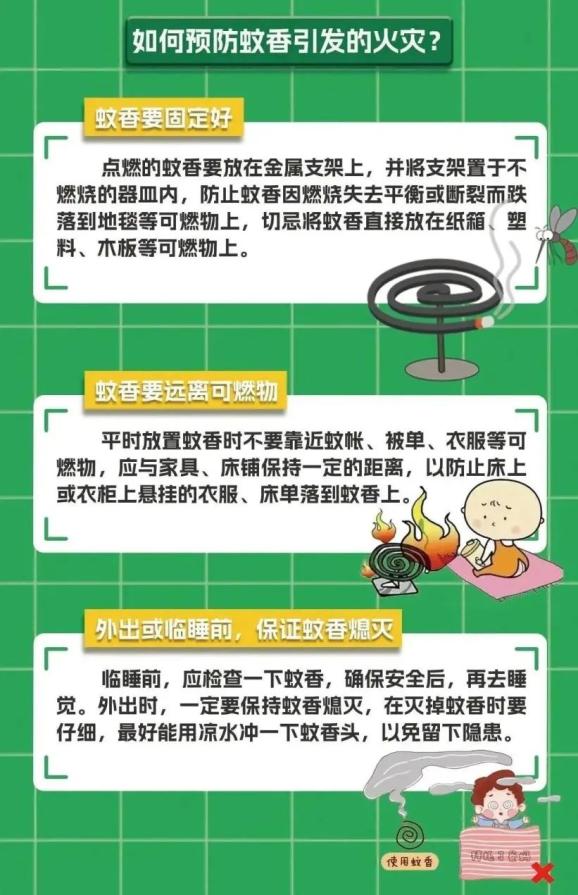两起火灾的原因都是:当事人把点燃的蚊香放在可燃物旁边,离开时没有熄灭点燃的蚊香,导致蚊香持续阴燃,引燃周围可燃物,最终引发火灾。虽然没有造成人员伤亡,但还是有几千元的经济损失。
