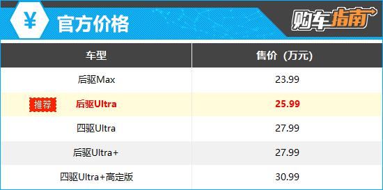 四驱 Ultra 与推荐车型相比,其核心升级是采用双电机驱动系统。虽然提高了汽车的加速性能,但由于大多数消费者对大功率的需求有限,其他功能配置没有相应升级,价格需求增加 2 万元,性价比不高。