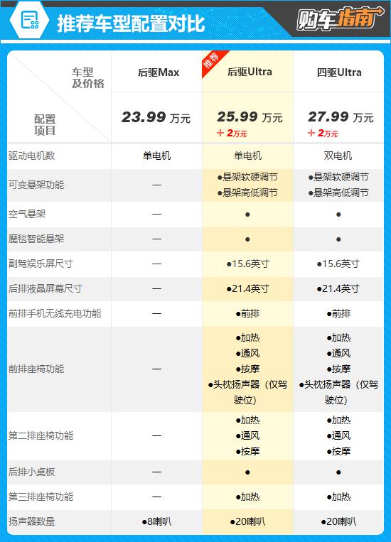 与入门级车型相比,推荐车型多了很多配备,包括 15.6 英尺副驾娱乐屏和 21.4 英尺后排液晶屏,科技感更强。同时,前排和第二排座椅都支持加热、通风和按摩功能。主驾驶座还提供头枕音箱,再结合后排小桌板和前排手机的无线充电功能,直接充满驾驶体验。更有甚者,推荐车型还提供了同价位的空气悬架和魔毯智能悬架。而且多余的这些配置只需要增加 2 一万元,性价比极高。