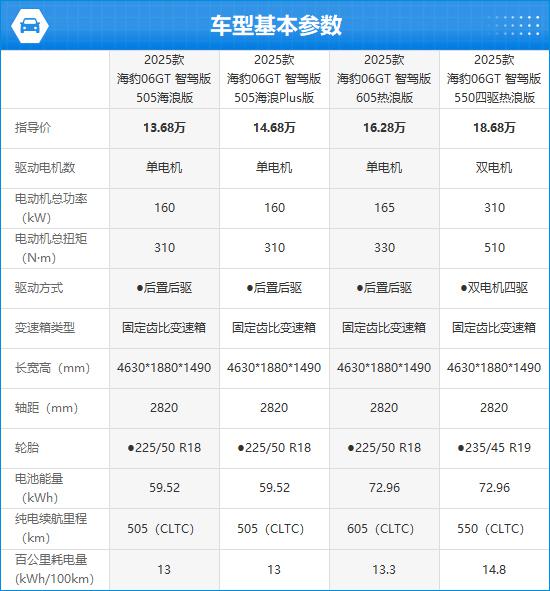 动力方面,2025 款海豹 06GT 提供两种选择:单电机后驱和双电机四驱。在这些规格中,单电机有两种,电机的总功率分别是 160kW 和 165kW;双电机四驱车型电机总功率电机 310kW。根据配置的不同,匹配容量为 59.52kWh 和 72.96kWh 磷酸铁锂“刀头”电池,CLTC 纯电续航里程分别为 505km、605km 和 550km。