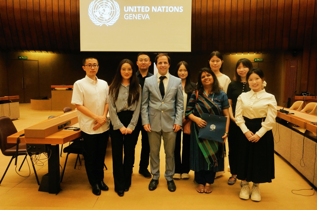 在瑞士日内瓦联合国总部实习考察马悦杨(左一)