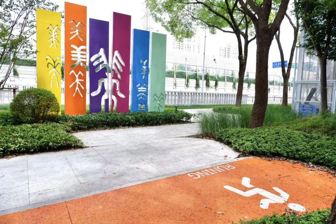 走在公园深处的临河步道上,水灵清澈的水色一览无遗,与两岸绿意相得益彰。此外,公园利用临水特性,结合“健身” “水环境”的特点,制定了创意文化小品设计,让居民能享受到天蓝水绿的自然风光。