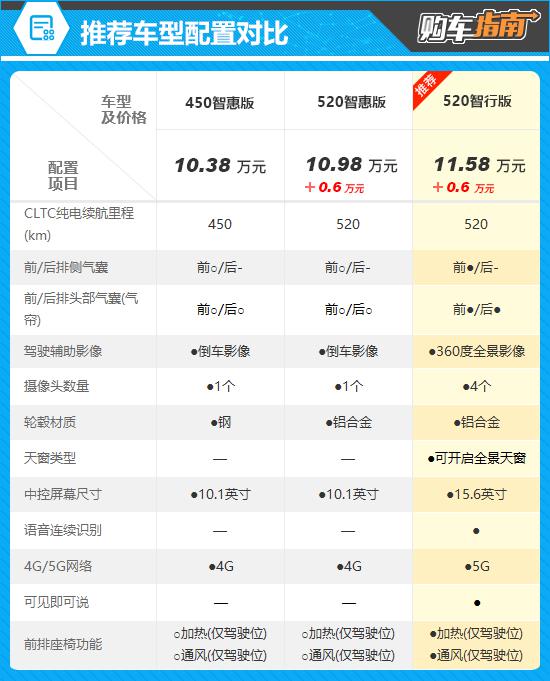 参考价为 10.38 万元的 450 智惠版是整个系统最入门的版本。从配置表可以看出,它的整体表现还是挺满意的,虽然配置实用。 LED 灯源远 / 近光灯、自动大灯、自动空调等。但是轮毂是钢做的,档次感低,纯电续航里程只有 450km,所以不推荐。