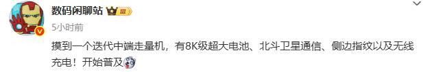它有着 8000mAh 等级电池,北斗卫星通讯,侧指纹和无线充电。