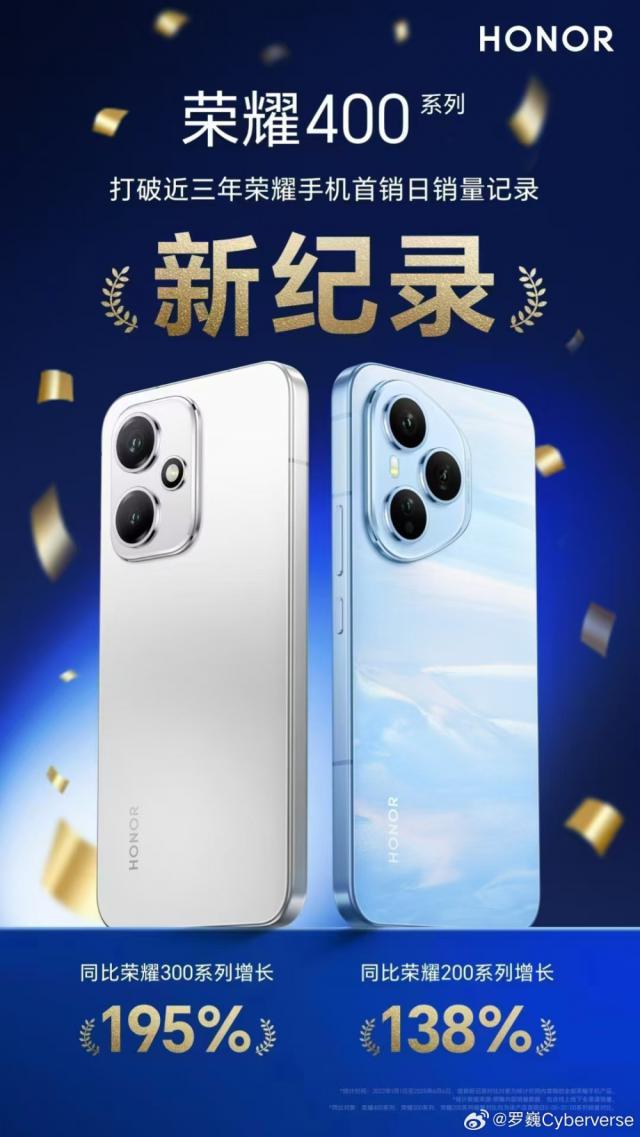 例如荣耀 400 该系列,打破了近三年荣耀手机首次销售记录。