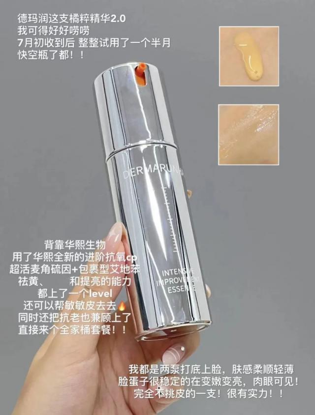 新颜精华德玛润菁 2.0 是一支堆放华丽的 K 氧化精粹,糖苷、阿魏酸、雨生红球藻提取物,麦角硫因、羟邈基泛酚、硫代牛磺酸、抗坏血酸葡萄糖苷、 ( 虾青素 ) ……