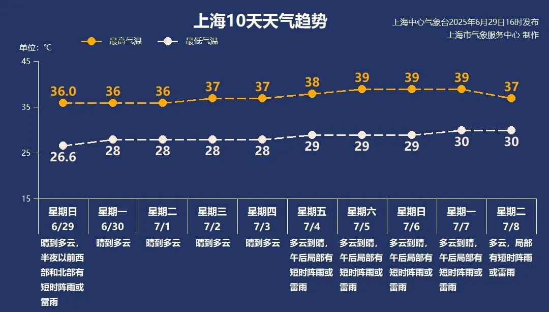 伴随着副热带高压的进一步向西伸展,本周以晴天和热天为主,高温持续。上半周最高气温为36、37℃周围,天气晴朗多云。周末,气温进一步升高,最高气温可能接近40℃。提醒大家特别注意防暑降温。