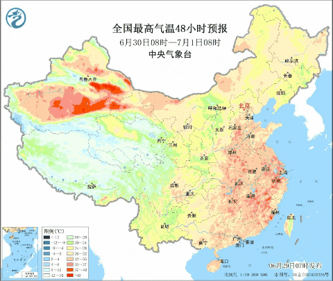 七月四日左右,江南中东部、华南中东部、江准、江汉东部、黄淮东部、南部等地最高气温35-39℃,可达40℃以上。