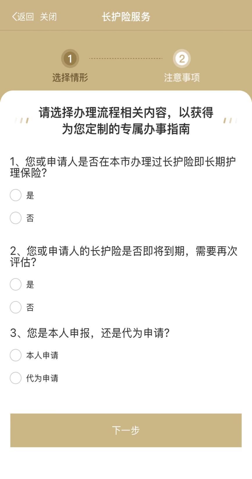 点击“长期保险期末评估申请”,进入“选择情况”,如实填写信息,选择“本人申请”或“代表申请”,点击下一步阅读“注意事项”。