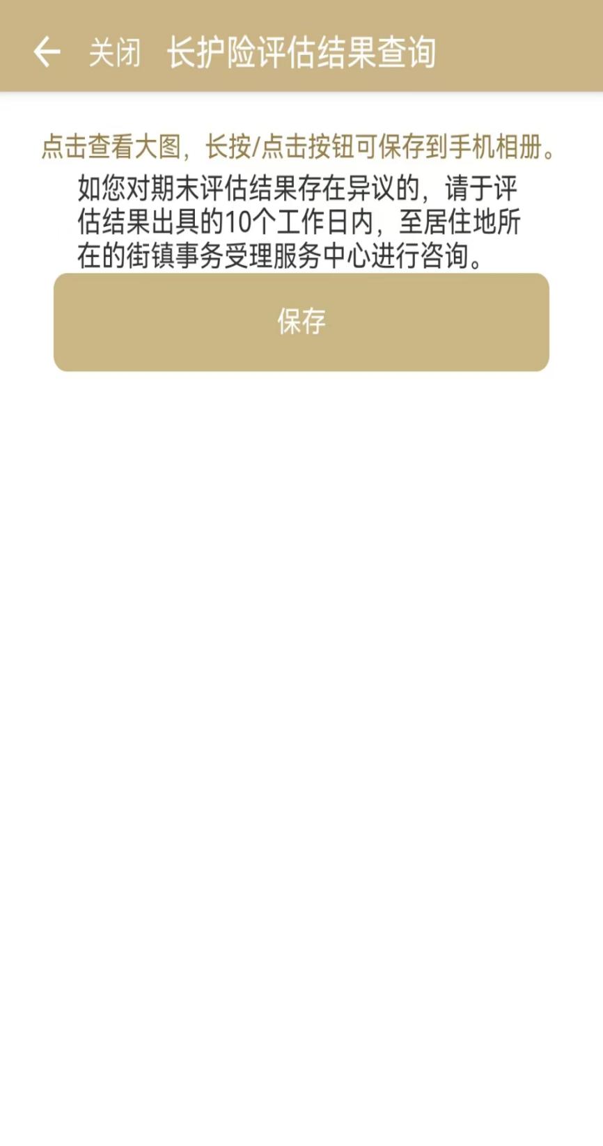 点击“长期保险期末评估结果查询”,输入姓名和身份证号码查询期末评估结果。只有我或申请人可以查询,评估结果可以保存在手机相册中。