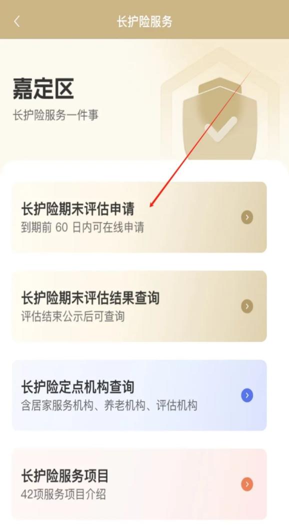 请点击“长护险服务一件事”首页,如果您需要进行长护险期末评估在线申请,请点击“长护险期末评估申请”。