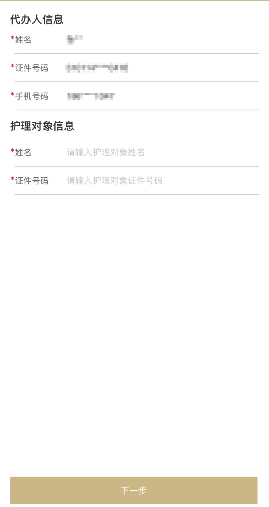 点击“在线处理”,填写护理目标信息。如果你是“我的申请”,系统已经填写了这里的信息,而“我的申请”需要手动填写护理目标信息。点击下一步填写详细信息。
