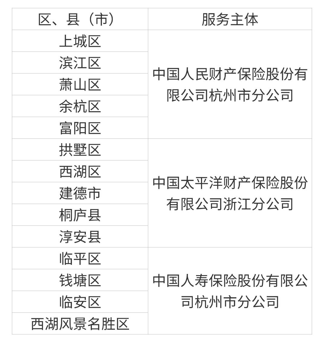 通过招标,新一轮中标承保单位为中国人民财产保险股份有限公司杭州分公司、中国人寿保险股份有限公司杭州分公司、中国太平洋财产保险股份有限公司浙江分公司三家保险公司。具体承包区域如下: