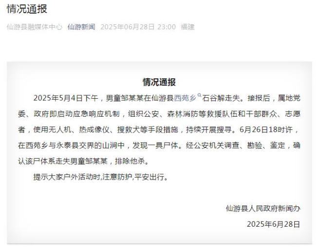 5月4日,一名8岁男孩和父母一起去福建莆田仙游县石谷爬山,出山时与父母失去了联系。许多方面不断进行搜索,事件引起了广泛关注。6月28日晚,福建莆田仙游县人民政府新闻办公室发布情况报告,确认该男孩死亡。据悉,石谷海拔1803.3米,是闽中第一高峰,也是未开发的野山。
