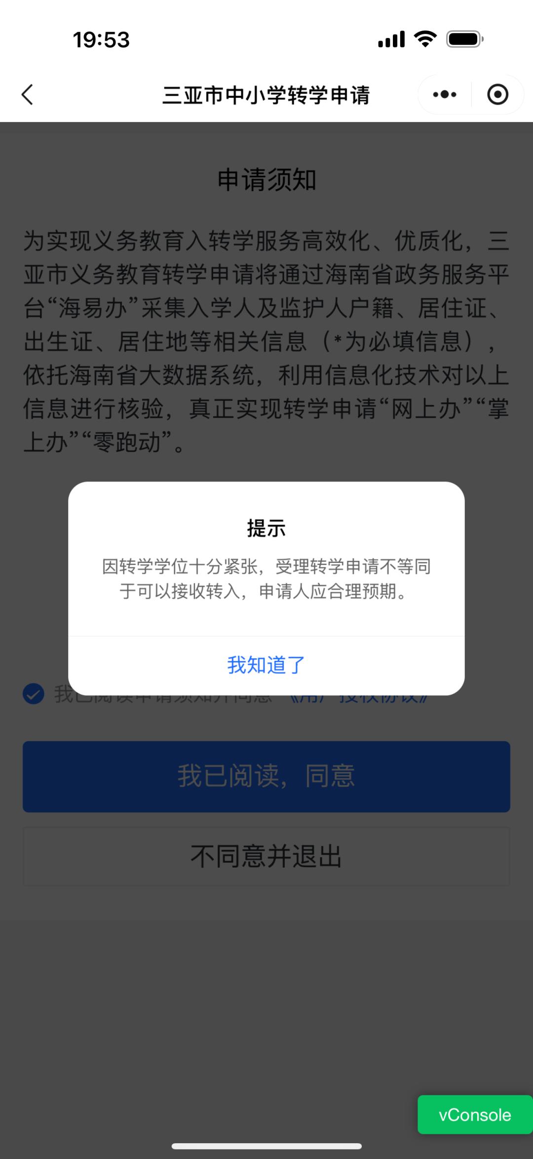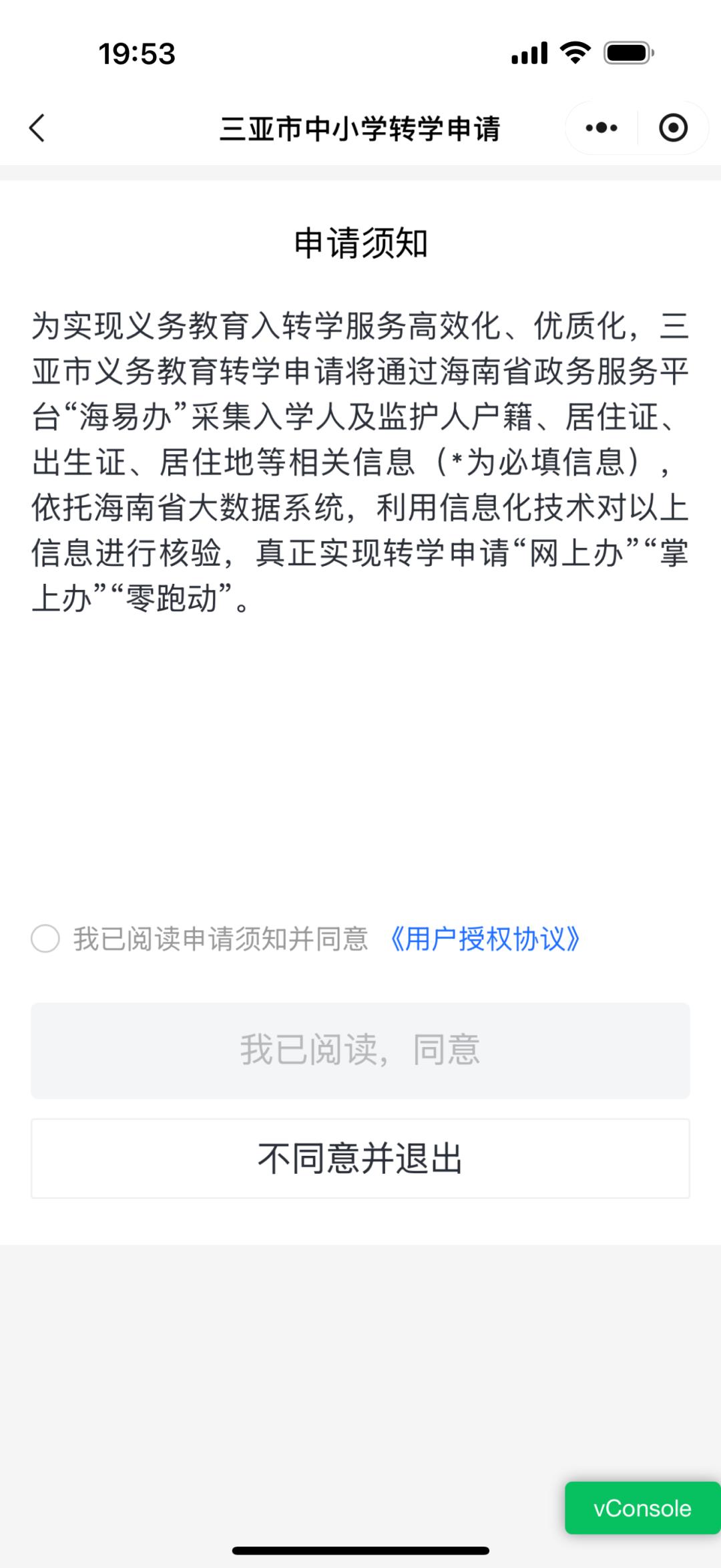 查看中小学转学申请说明,查看“我已经阅读了申请说明并同意”,点击“同意”按钮进入下一步。