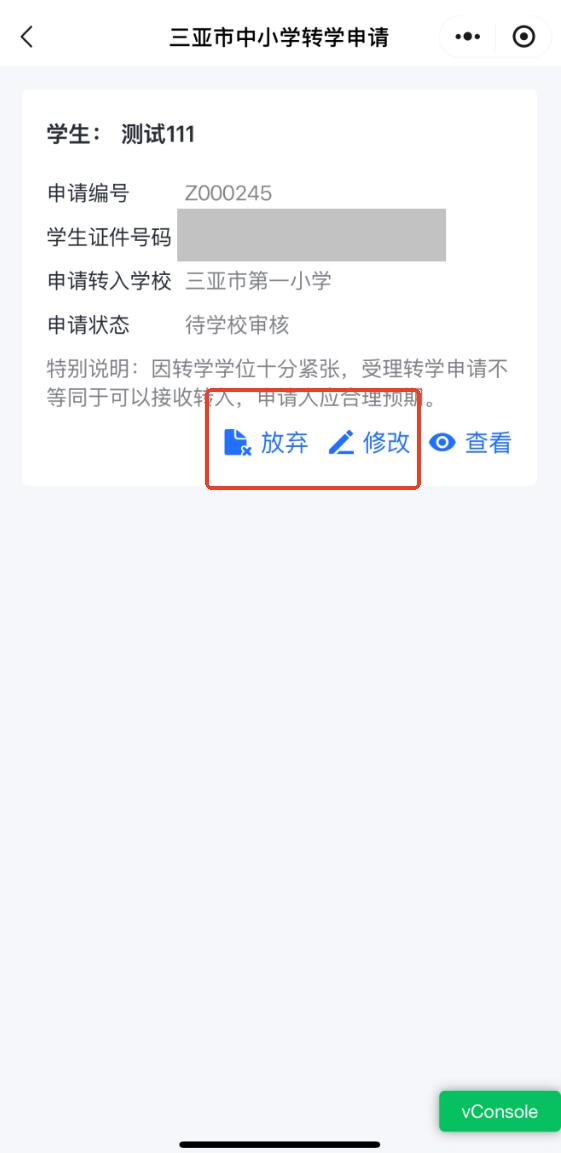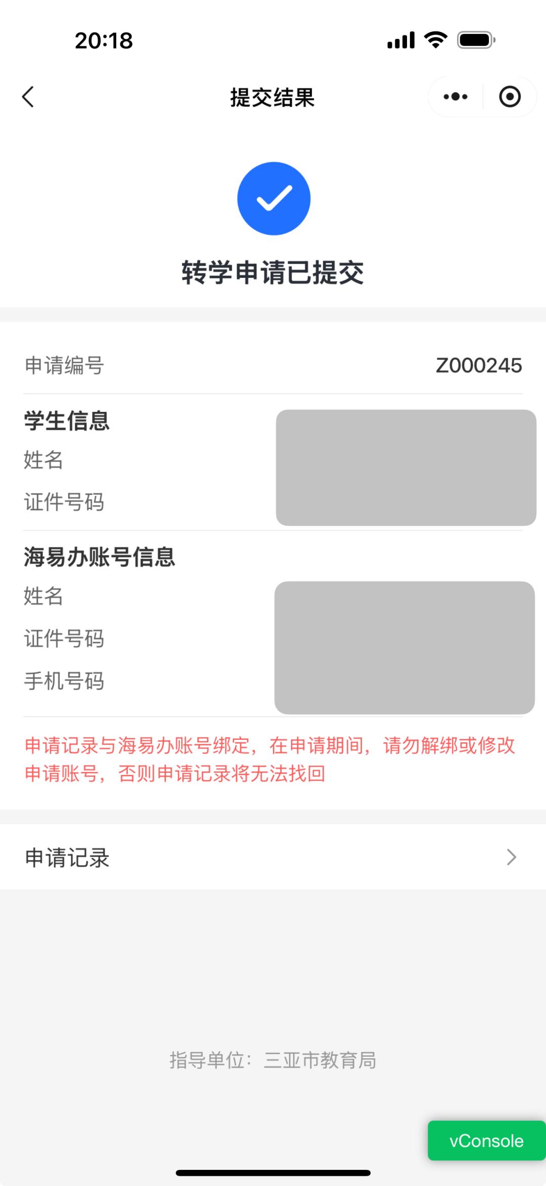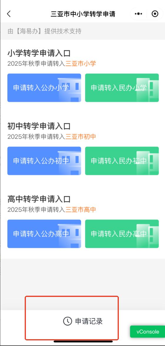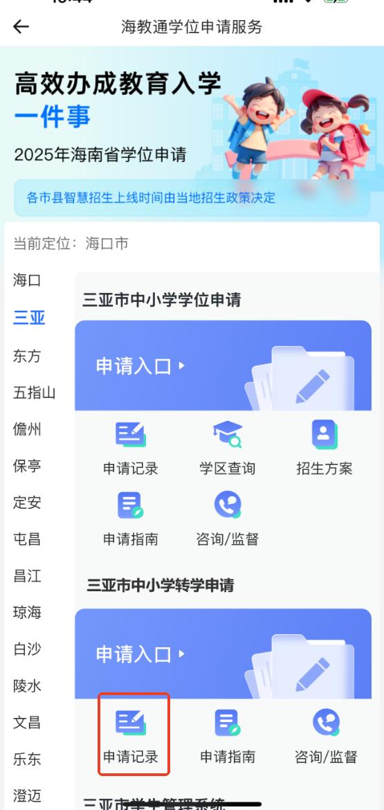①家长可以在三亚市专区的“申请记录”或中小学转学申请入口底部的“申请记录”中查看已填写的信息;