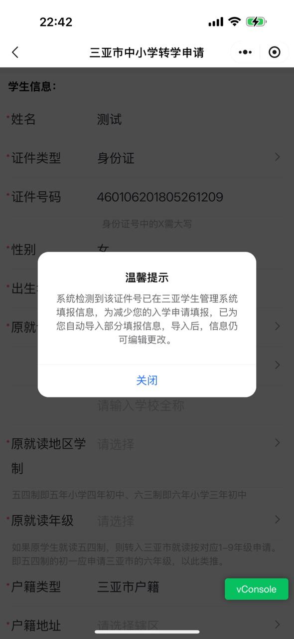 填写录取人员的姓名 身份证后,系统会根据输入信息查询学生是否已经在“三亚学生管理系统”中填写了信息。如果已经填写了信息,系统会自动导入学生填写的信息。导入后,信息仍然可以编辑和更改。建议使用海易办的账号,在三亚学生管理系统中填写学生信息,不使用同一个账号就无法导入信息。