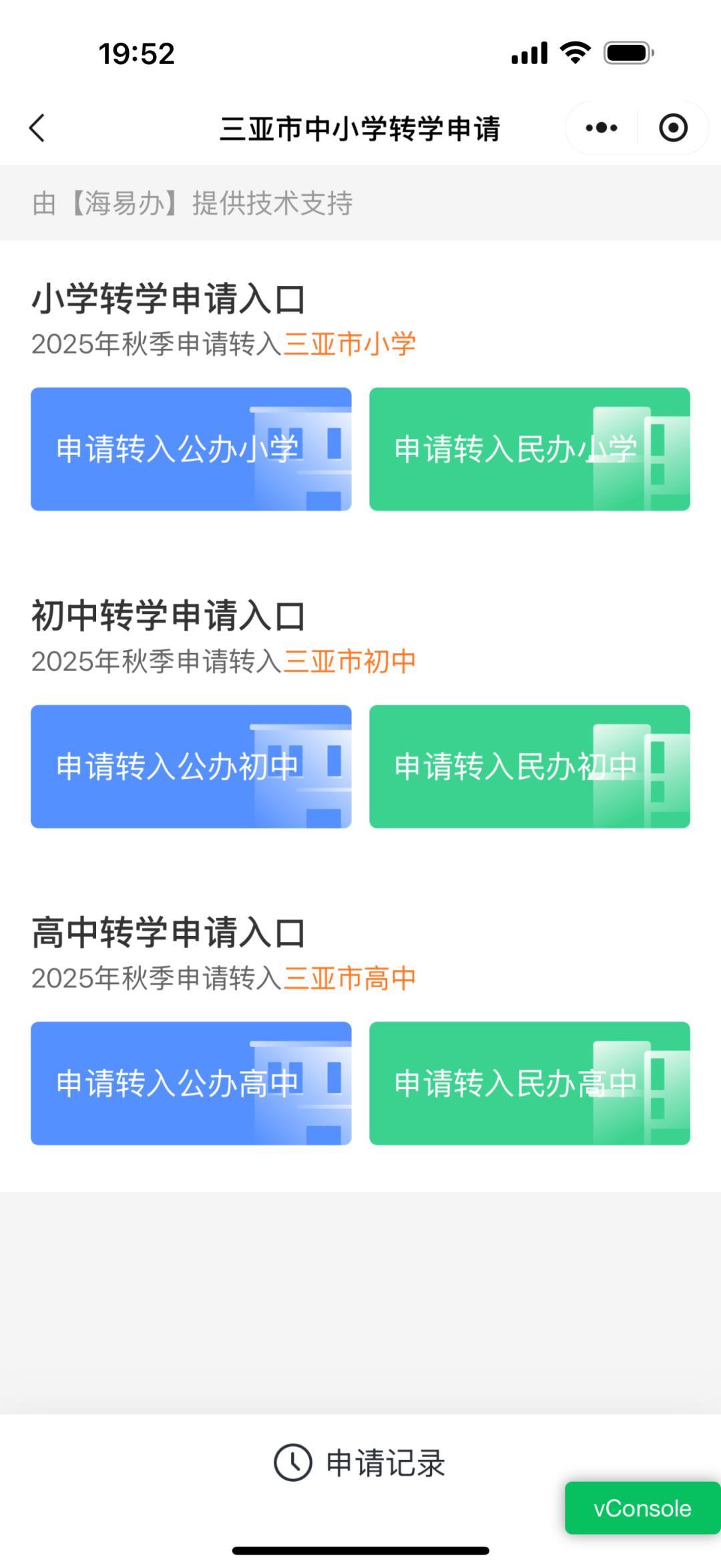 打开“海易办”APP或“海易办”支付宝和小程序,点击首页【2025海南省学位申请专区】进入海南省学位申请专题页面;系统根据目前的定位准确定位到三亚(如果定位错误,可以手动切换到需要申请入学的市县),点击三亚市中小学转学申请的【申请入口】,开始填写信息。