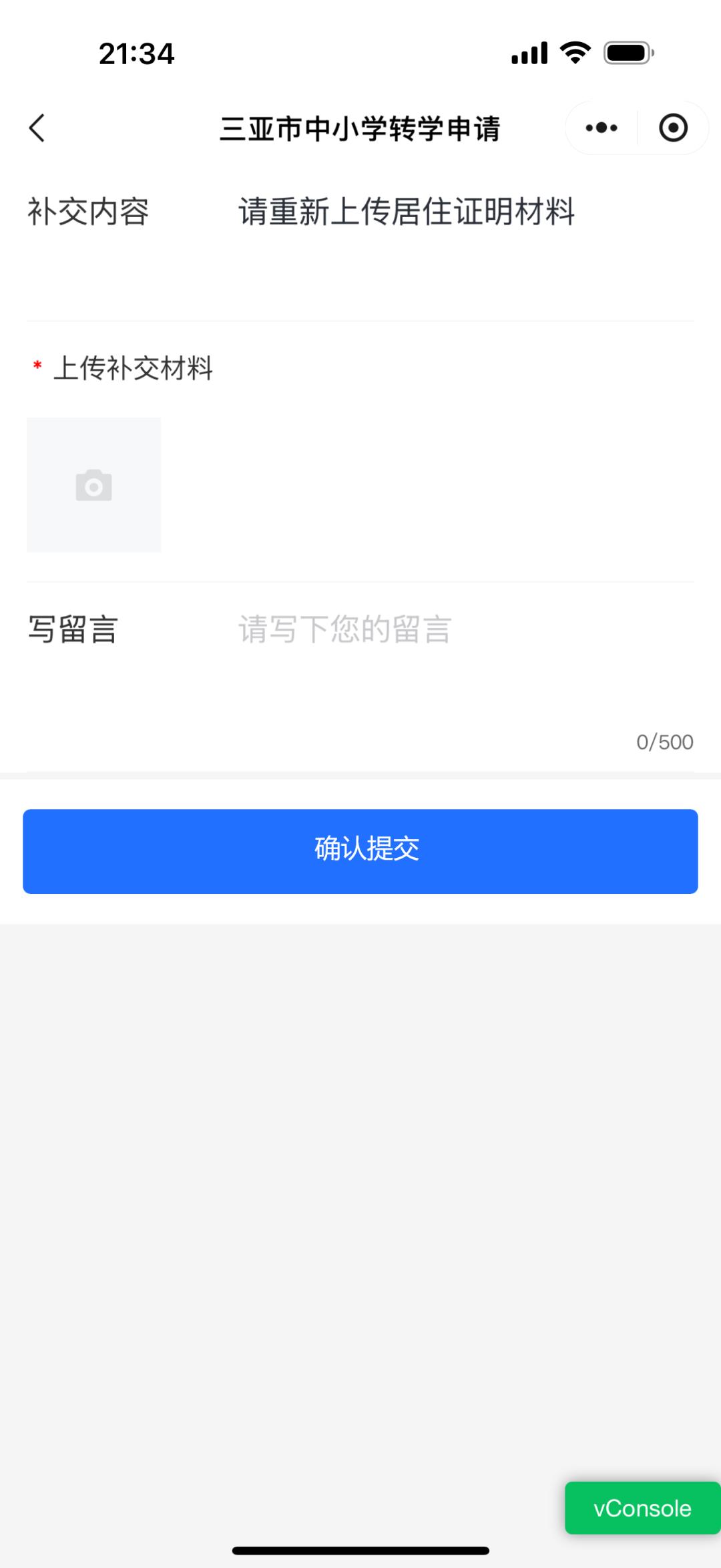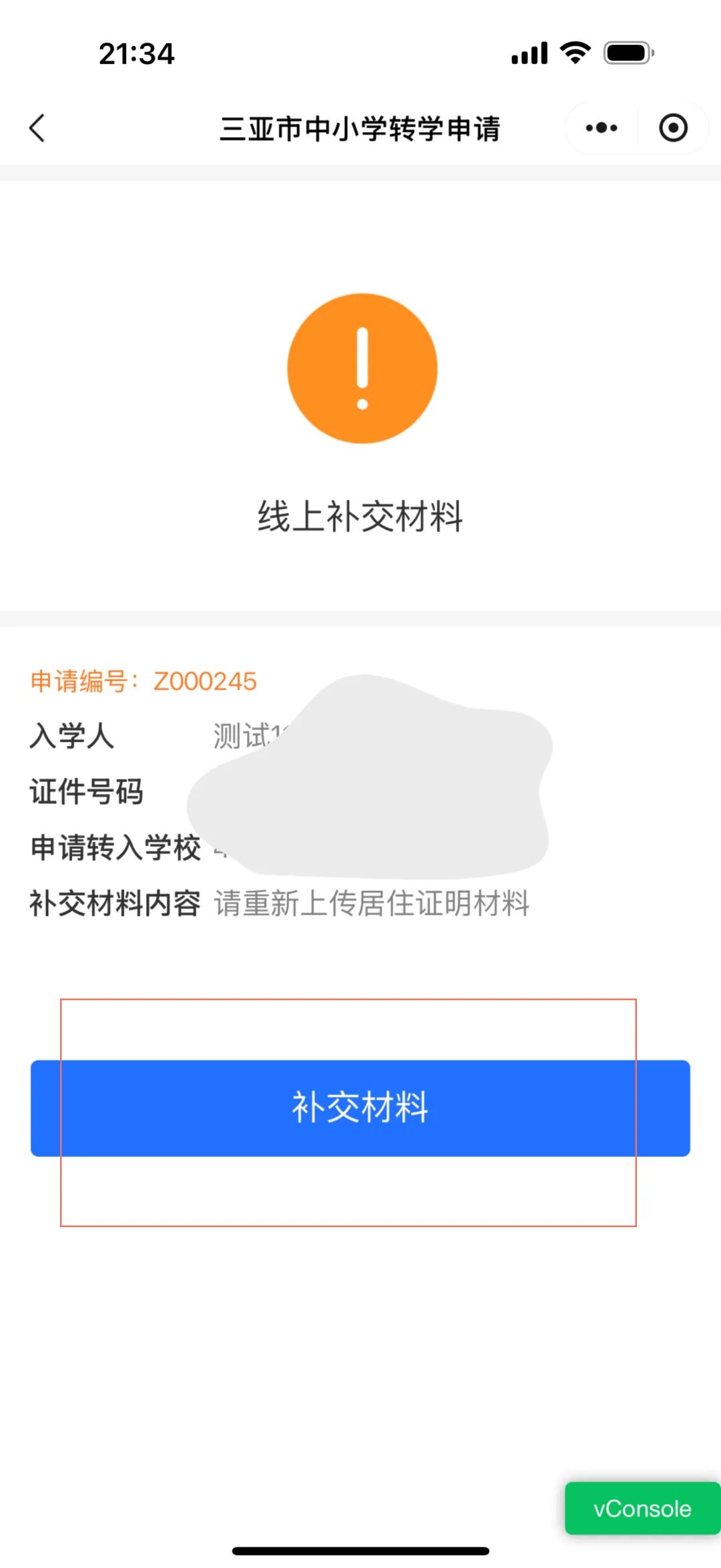 点击“补充材料”按钮,可以查看需要补充的材料,拍照上传相关材料提交,也可以通过留言补充说明情况。提交材料后,学校或教育局可以重新审核。