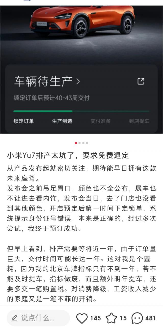 虽然小米汽车也表示,产能上升后的交付周期会动态缩短。但是很多锁单用户已经陷入了焦虑。