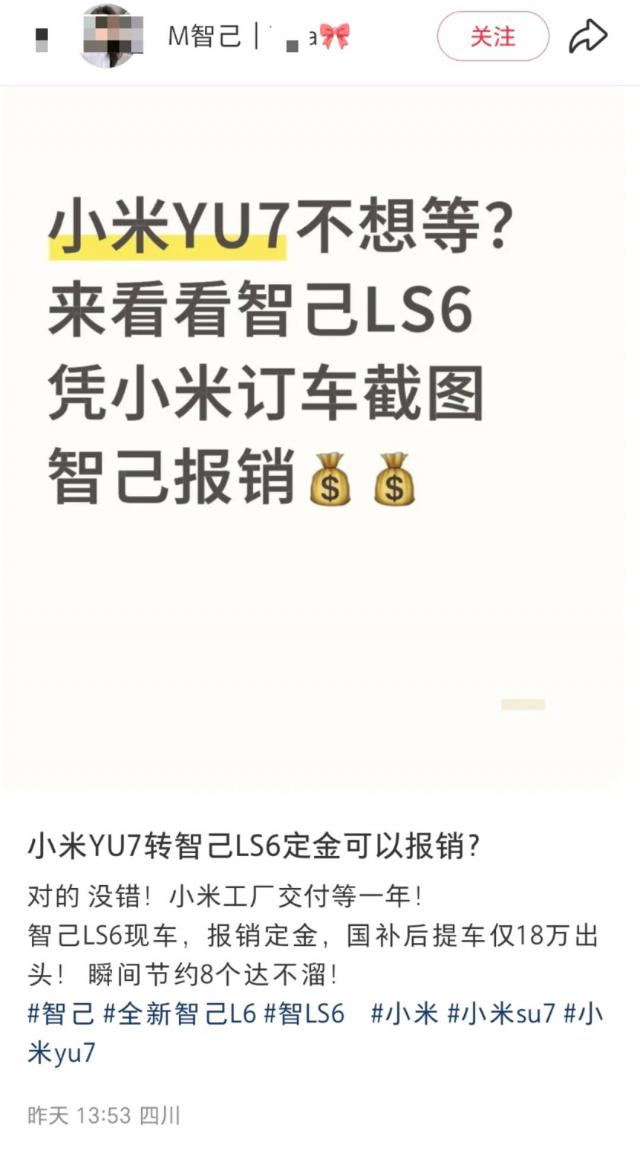 在社交平台上,极客、阿维塔、智己等品牌销售顾问也表示有这样的政策,他们在小米。 YU7 在锁单用户下面留言,表示凭锁单信息可以报销。 5000 人民币定金,有些销售甚至在评论区 "手把手" 指导退订程序。