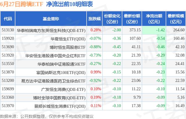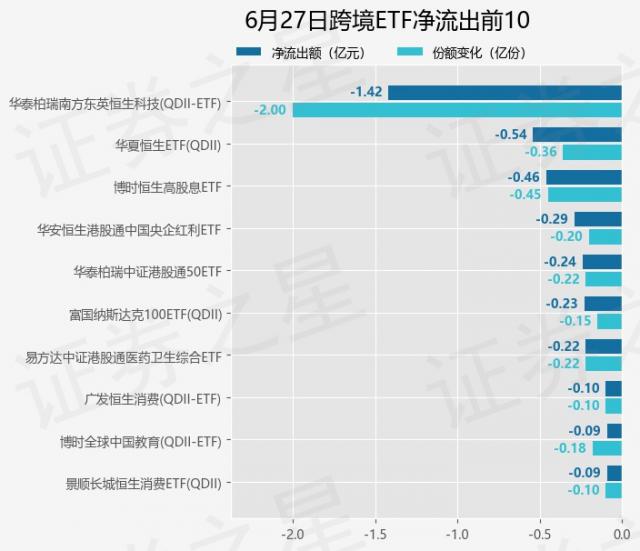 当天有 16 只跨境 ETF 资金净流出,其中华泰柏瑞南方东英恒生科技排名第一。 ( QDII-ETF ) (513130),份额下降 2.0 一亿份,净流出额为 1.42 亿元。