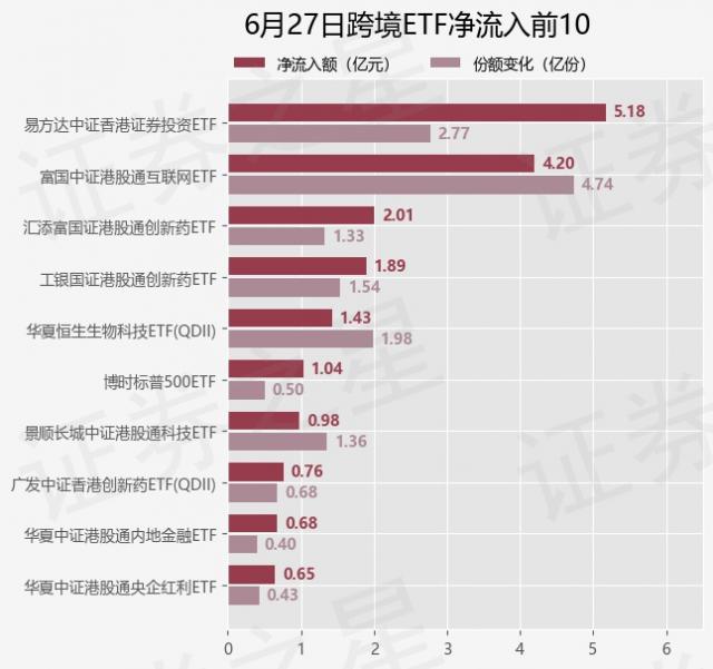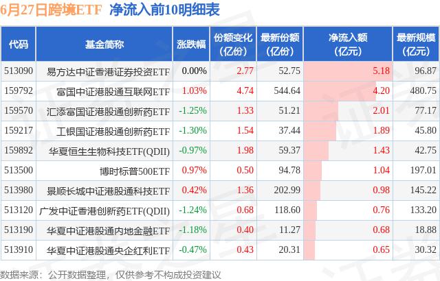 当天有 38 只跨境 ETF 资金净流入显示,其中易方达中证香港证券投资净流入排名第一。 ETF(513090),份额增加 2.77 十亿份,净流入额为 5.18 亿元。