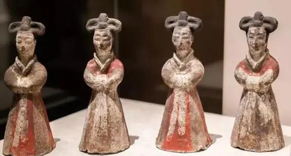 在魏晋陶俑中已经有了披丝的身影,此时披丝更短更宽,更像是围巾。“释名”云:“披肩背, “如南北朝庾信的《奉和赵王美人春日诗》:"步摇钗梁动,红轮角斜。"简文帝《倡妇怨》:"散生披红色,生爱新约黄。