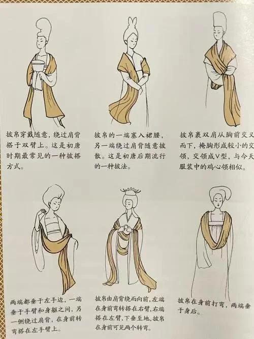 隋代壁画与唐代文物里面已经有很多丝绸形象了。此时此刻,它们又长又窄,成为流行的搭配物品。这样的配饰和汉服相比也很美。唐代女性对丝绸的热爱可以参考《旧唐书》 · 舆服志的记载:“风俗奢靡,不依格令,绮罗锦绣,随心所欲。从宫掖到匹配,递相似效果,没有区别。”这时,我们已经可以看到各种各样的围法了。