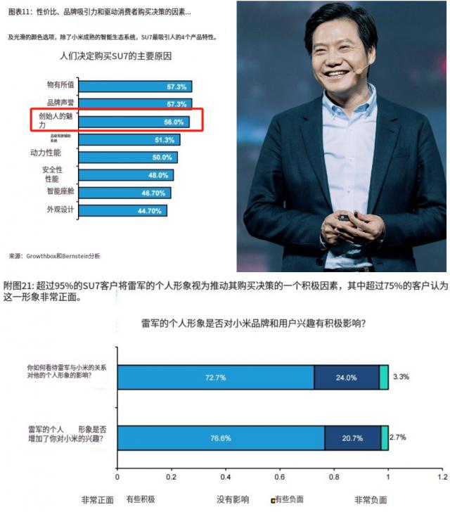 一个是雷军,之前的调查报告显示,买小米车的人都有。 95% 有人说雷军人格魅力对于购买有积极的促进作用,当然它背后也有一个巧妙的公司经营理念,包括精细化营销的推广。